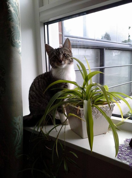 Sussi er sky. Svart/brun/grå-stripet på ryggen, hvit på bryst og mage. 1 år og 3 mnd gammel