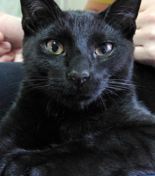 Helt sort i pelsen. Korthåret. Har noen hvite hår på innsiden av bakbeina etter operasjon av bakbeina som kattunge. Føflekk i gane. Grått halsbånd med telefon nr. Veldig kosete, men redd skarpe/høye lyder.
