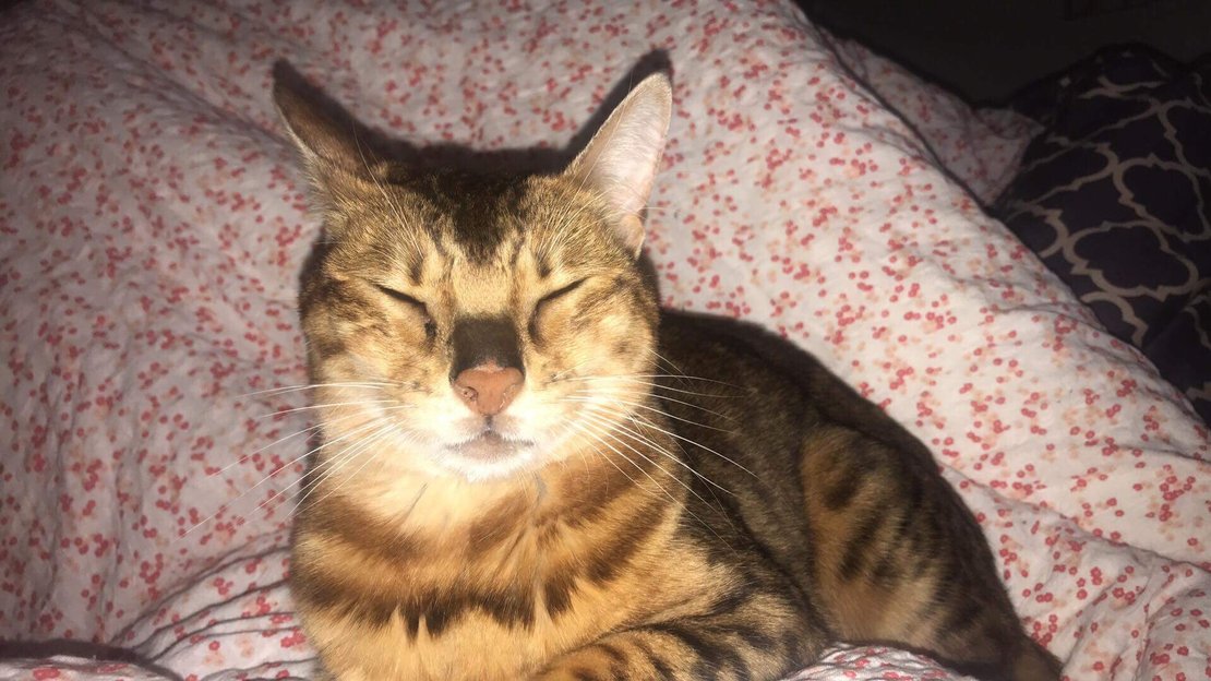En slank og fin tigerstripet pus. Kan være rasekatt(?)