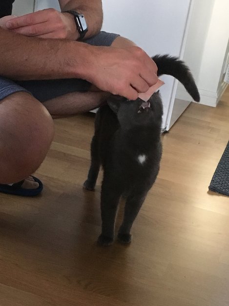 Pus er mørkegrå med et 'hjerteformet' hvit flekk på brystet. Bilde viser dette. Er veldig koselig og glad i mennesker. Kommer å koser med oss og noen ganger sover hos oss.