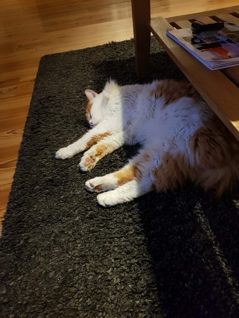Tett tårekanal og ofte puss fra øynene, når det er vasket bort er det stripe fra øyet og ned mot snuta. Han har en liten knekk på halen men det merkes ikke om ikke man koser med han. Han har orange halsbånd med katteluke chip