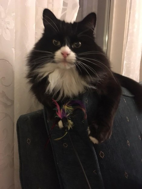 Glatthåret på kroppen litt langhåret rundt hodet. Kun hvitt på nese og hals og poter. Resten av kroppen er svart. Dette er en sky og forsiktig katt.