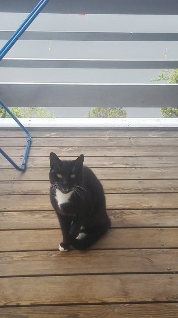 Katt funnet, den er svart med hvite poter og hvit i bryter.