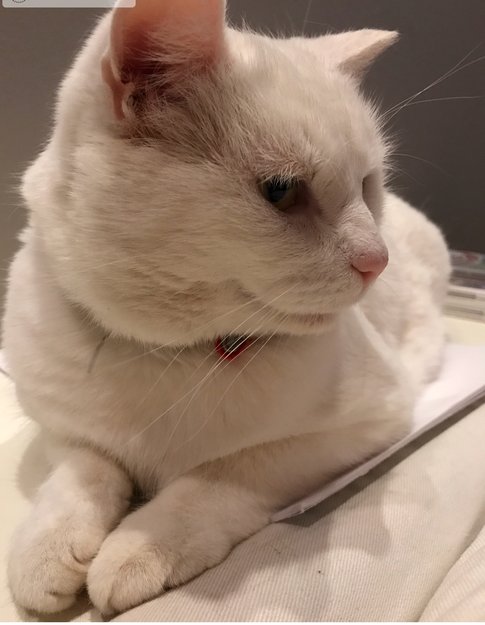 Namsen er helt hvit, og kort pels. Han reagerer på navnet sitt og pleier å komme når vi roper på ham.