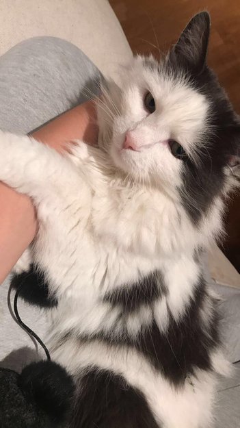 Hun er en hvit katt med store grå flekker over store deler av pelsen. En av flekkene dekker ørene og toppen av hodet hennes, og en dekker hele halen. Hun er en kosete, snill og vakker katt.