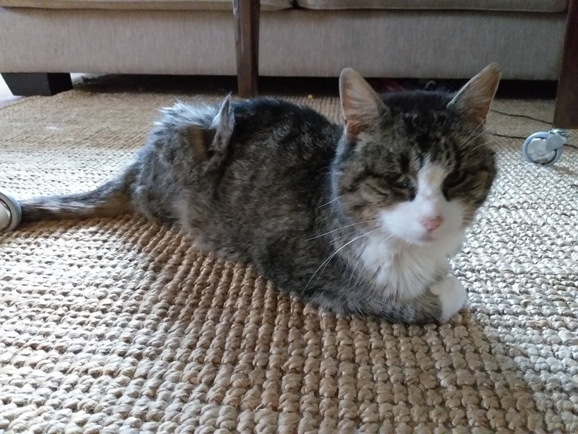 Dukket opp på trappa vår i Fetsund. Den har nok gått ute en stund, er klumpete i pelsen og ganske tynn.