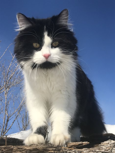 Tarzan er svart og hvit hannkatt, egentlig langhåret men blitt barbert tidlig i sommer så han har begynt å få igjen litt av pelsen sin.. på haken har han også svart flekk som ser ut som «skjegg», halen hans er helt svart