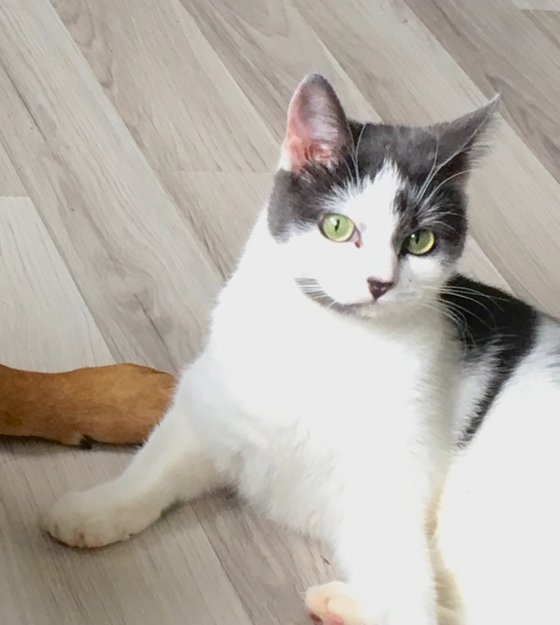 Hun er en flott liten jente på ca. 3kg. Halen er grå, (mens mest parten av) bryst, mage og potene er hvit. Hun er lett å kjenne igjen med hennes store gul/grønne øyner. Innsiden av ørene er lyse rosa, og hun har en liten rosa flekk på nasen også. I tilleg har hun en rund grå flekk på høyre framben, en rund grå flekk på venstre bakben, og en nærmere grå oval flekk under haken hennes.