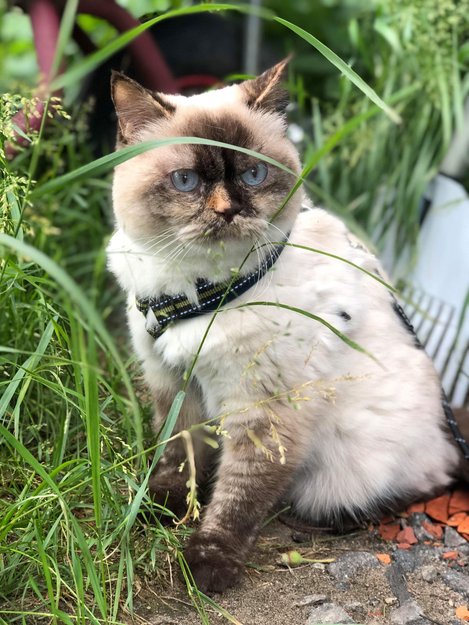 Molly har et siameser mønster på kroppen og hun har noen litt små oransje flekker på nesa.