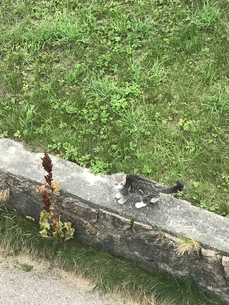 Kattunge rusler rundt og mjauer rundt huset vårt. Virker som den har gått seg bort og er veldig kontaktsøkende. Jeg får ikke tatt han inn i hus pga. Hund dessverre.. grå og hvit med nydelige gul/oransje øyne