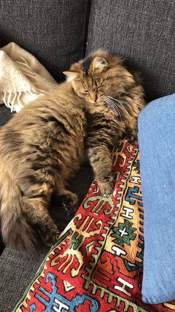 Blandet farge med langt hår. Lager ofte en trillelyd, er nysgjerrig og tillitskapende. 1,5 år gammel. Chippet og øremerket. Har lyse hår i øret og litt mørkere i pelsen over ryggraden.
