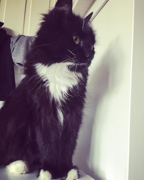 Ibsens mamma var en norsk skogkatt men hun er en blanding. Lang pels, hvit under haka og på bryster. Hvit på labbene på fronten ellers svart. Svart nese.