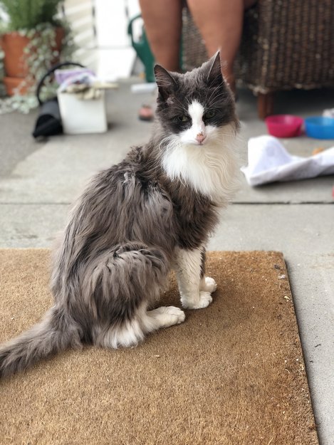 Pusen har vaket rundt huset vårt de siste dagene. Den er tydelig veldig tynn, og vi har gitt den litt mat og vann. Den har øremerking, men vi klarer ikke lese det skikkelig.