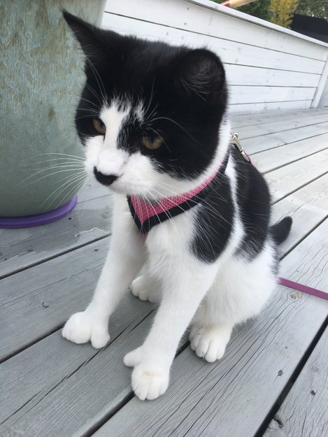 Svart og hvit jente , skipskatt med ekstra tær på alle potene. Hun er vanligvis uredd og kosete.
