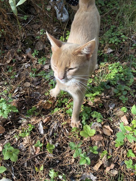 Låg i busken och mjauade i natt och vill inte gå härifrån. Fått mat och avmaskning av oss. Superkelen och fin!
