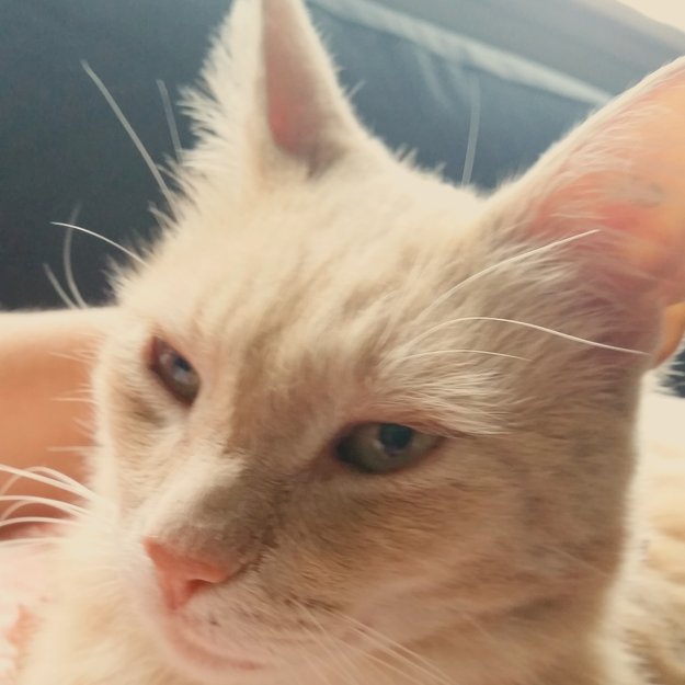 Har små hakk på øreflippene, etter slåssing. Han er CHIPET ( men står på ei som heter Michelle )