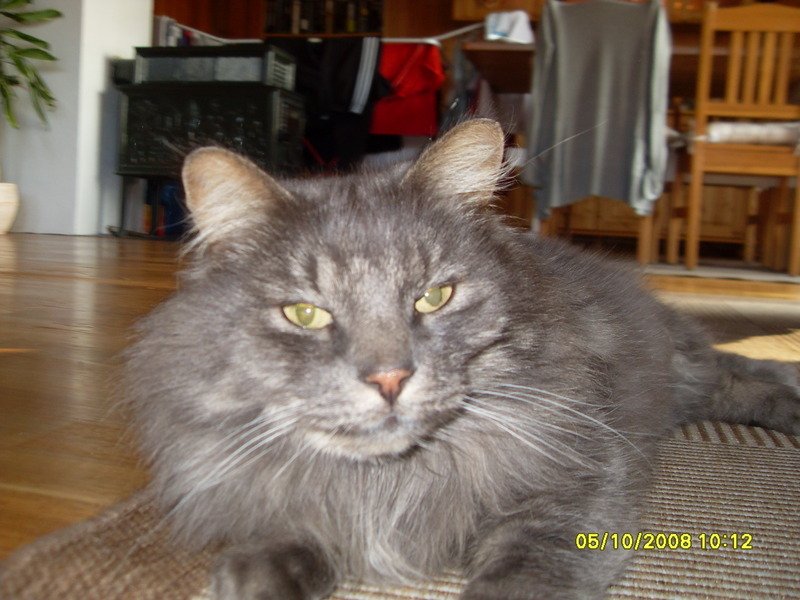 Stor langhåret hankatt. Han er sky og litt sær når det gjelder fremmede mennesker. Han er en skikkelig kosegutt som ikke liker hverken regn eller snø.