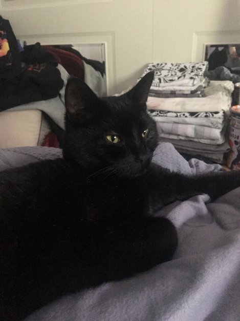 Snakkesalig svart katt som fulgte etter oss i ca 3 km. Litt sky i starten men var likevel veldig bestemt for å følge etter oss. Roet seg når han fikk kommet seg inn og spist. Veldig sulten.