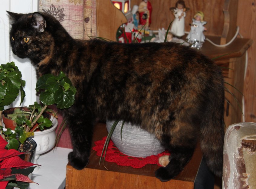 Høyre bakpote har endel hvitt helt ned, og litt hvit på halsen. Er sky og lettskremt.