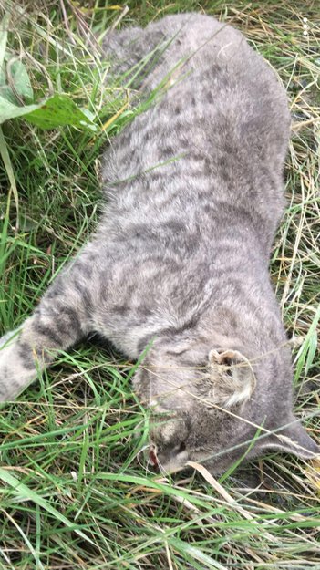 Grå hannkatt med noen mørke tigerstriper. Påkjørt.