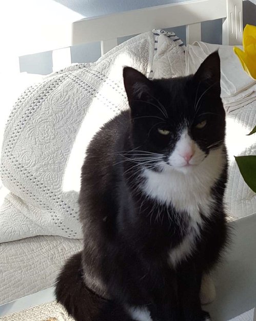 Sakarias er i hovedsak svart med hvit snute, hvitt bryst og hvite poter både foran og bak.