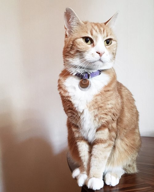 Oransje tigerstripet hunnkatt med hvite felt i ansikt, på bryst/mage og poter.