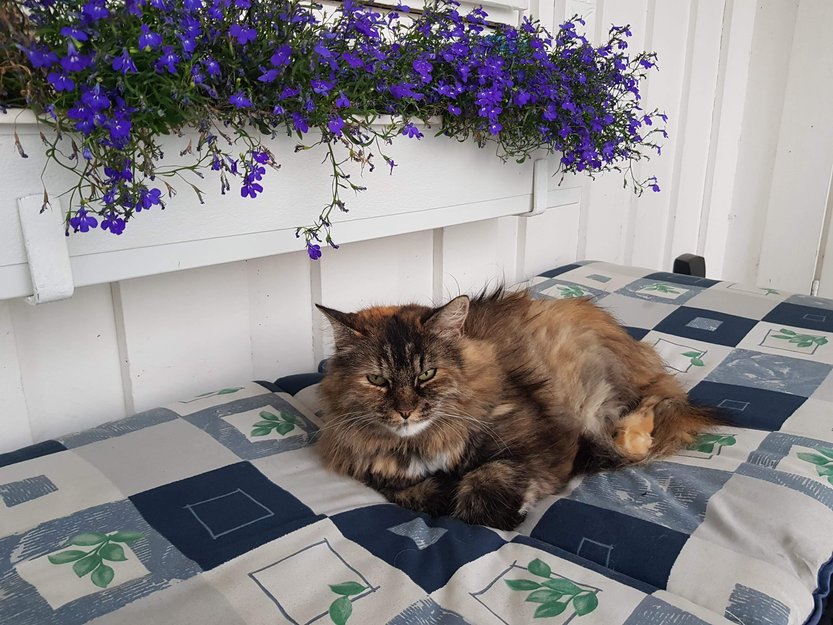 Hun har blitt klipt litt bakerst paa ryggen rett ved halen pga. tover. Hun har mange farger og kan minne om en skogkatt.