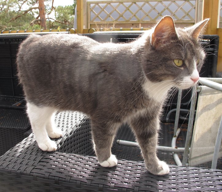 Forholdsvis liten pusejente, 3 år gammel, kastrert og chipet. Hun har en M tatovert i ene øret, ikke så lett synlig.