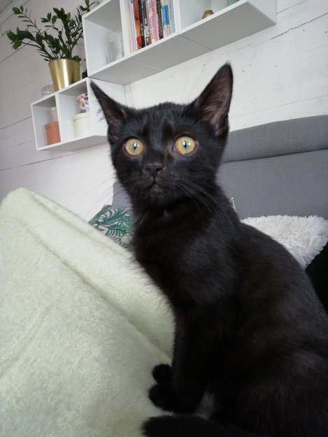 Knerten har kort, sort pels med et par hvite haar paa brystet. I solskinn kan man skimte noen striper i pelsen. Han har paa seg et knall gult halsbaand med refleks. Gronn/gule oyne.
