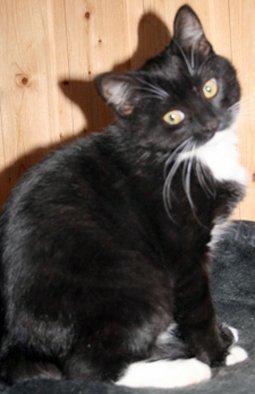 "Traore" er en korthåret kattunge i fargene svart med hvit: hvit hake og bryst, hvite tær foran og hvite halvsokker bak.(bildet kommer / admin)