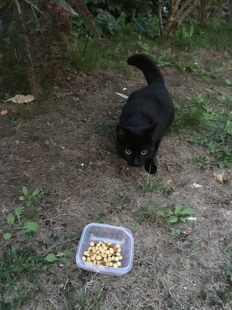 Katten kom inn i vår store og inngjerede bakgård ca mandag denne uka. Er mye her. Mjauer mye og lenge. Er nervøs og engstelig. Vil ikke ha kos. Vi har begynt å mate den og gi den vann. Er mye sammen med de andre kattene som bor her.