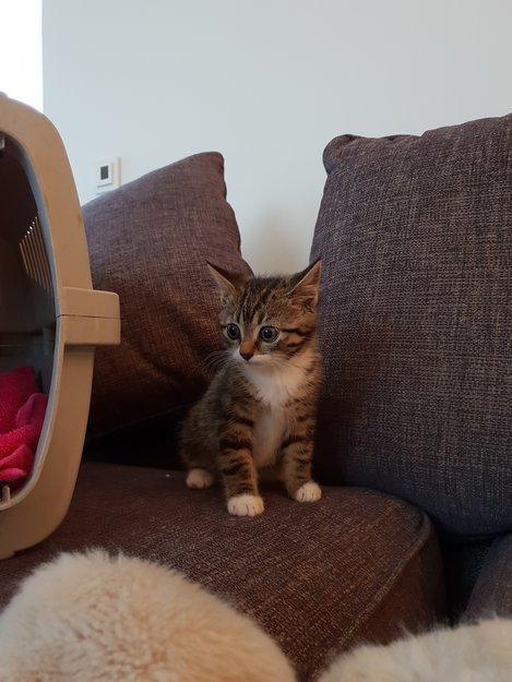 Katten satt midt på veien i 80-sone sent på kvelden. Vi stoppet bilen og gikk ut i skogen, katten var veldig redd og det virket ikke som om den var vant til mennesker. Vi klarte å fange den og har den nå hjemme.