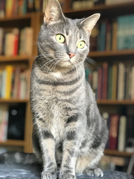 Korthåret grå katt med noe stripemønster. Har ikke halsbånd men er chippet. Lyder navnet sitt, Tofu. Gule/Grønne øyne.