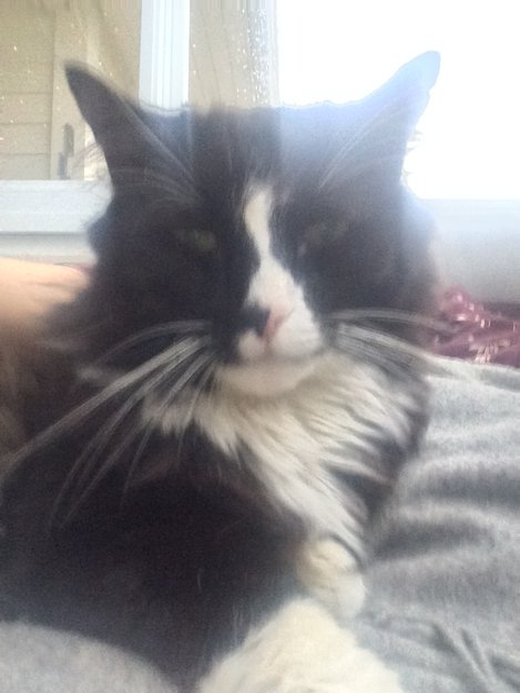 Tam hannkatt med lang pels. Sort over hode og rygg/hale, hvit over nese, under hake og på undersiden. Hvite poter.