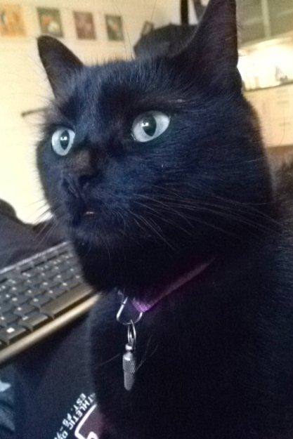 Helt sort, utenom et lite hvitt felt under haken. Hun har ikke på seg halsbånd.