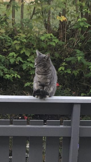 Spotter på mage, barbert mage, brune poter, verbal katt, liten hunnkatt, stripete hale.