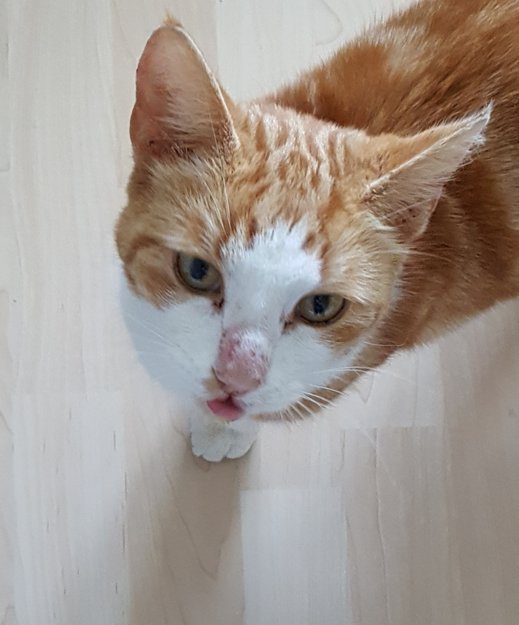 Kastrert hannkatt, ingen ID. Har et sår på nesen, katten er veldig tynn og bærer preg av å ha gått lenge uten mat. Veldig tillitsfull og tydelig vant med mennesker. Har en hes stemme.