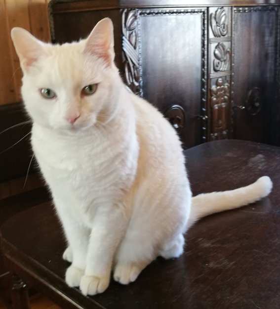 Stor hvit hankatt på ca. 7 kg. Noen vil si att det er tatovert 10 i øre men det er id. Han er kosete og lyder navnet sitt.