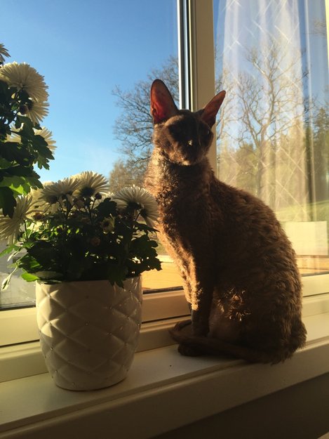 Han har fløyelsmyk bølgete pels og gule øyne.