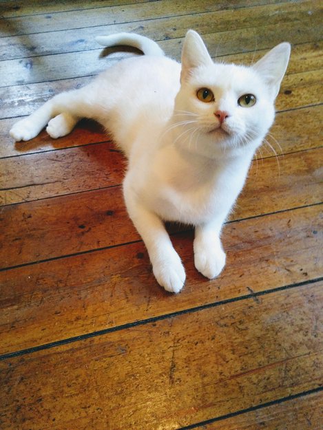 Kvit korthåra hannkatt, ca 10 mnd gamal. Gule auge. Nokre få svarte hårstrå mellom øyra. Litt butt ansikt. Winter er sjenert og svært god til å gøyme seg. Han kjem sjeldan når han vert lokka på. Men han er snill og veldig veldig glad i kos :)
