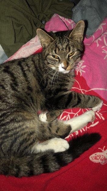 Han er en liten ukastrert hannkatt, 6 mnd gammel, hvit på halsen, hvite poter og har en stor svart stripe på ryggen.