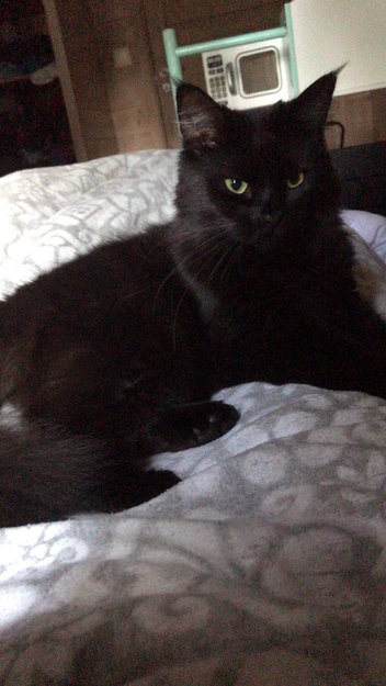 Brunsvart langhåret, gule øyne. Mye mulig han gjemmer seg om du prøver å oppsøke han.
