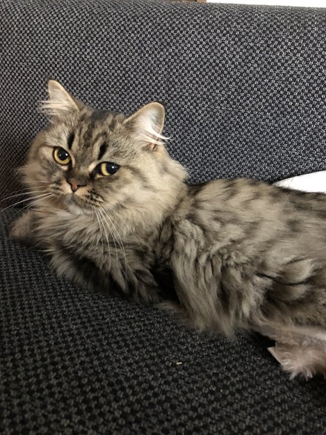 Ser ut som en perser blanding eller scottish straight. Store runde gul/brune øyne. Tykk og myk pels, med eksta mye pels på halen. Fargen er brun / grå med lyse striper.