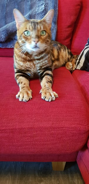 Svært spesielle og symmetriske tegninger i pelsen. Mørk brun og lys brun. Tigerstriper på poter. Hvit rundt munnen/værhårene. Helt grønne øyne. Se bilde.