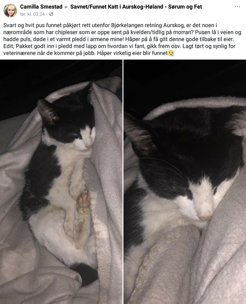 Funnet påkjørt rett utenfor Bjørkelangen retning Aurskog 😢 Pusen lå i veien og hadde puls, døde i et varmt pledd i armene mine! Håper på å få gitt denne gode tilbake til eier. Katten levert timBjørkelangen. Håper virkelig eier blir funnet😢