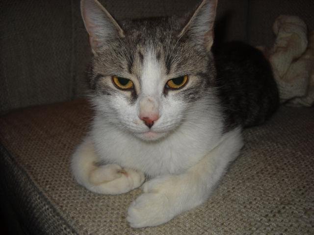 Mørk- og lysegrå stripete skipskatt, med hvit mage / bein og gule øyne. En ekstra tå på frambeina.