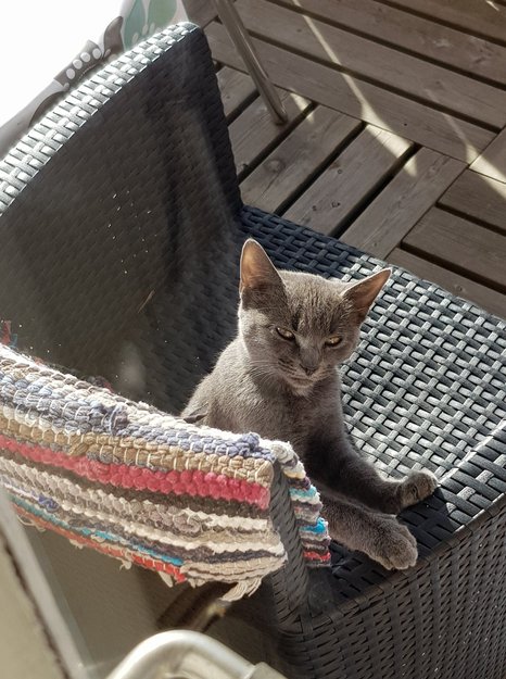 Liten, kjælen og veldig selskapssyk kattunge, grå med litt striper i halen.