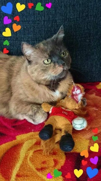 Hun er brun, blandet med grå fargen. Det ene øyet er litt større enn det andre øyet.