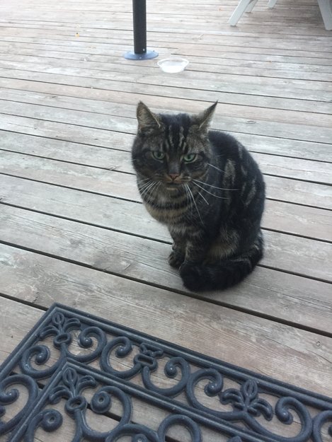 Katt oppholder seg på våres terrasse sover her på nettene også siden torsdag sett i området en stund velstelt i pels grå og mørk på rygg.tigerstripet grønne øyne ikke. Chippet.