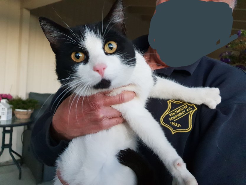 Katten har vært innelåst i garasjen til naboen i 2 dager, fredag 28 kom han på verandaen til finner og ville ha mat. Finner tok katten og kjørte rundt til mange i nærmiljøet, men ingen eide han.